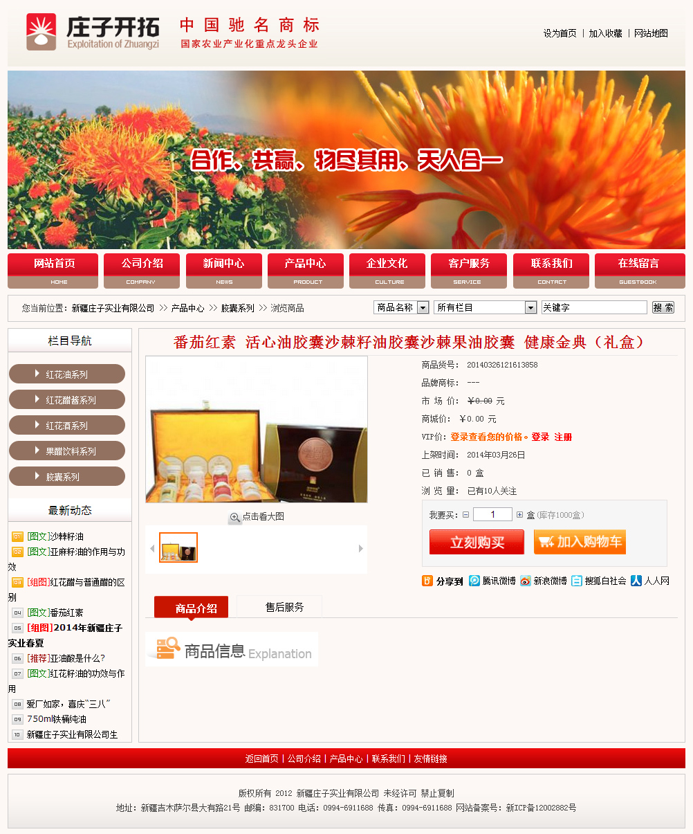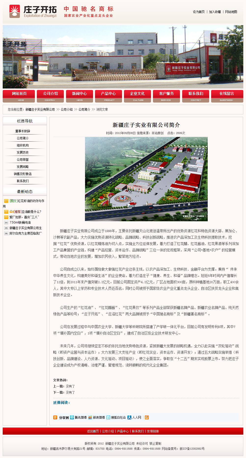 新疆莊子實業有限公司成立于1998年,主要依托新疆天山北坡逆溫帶所出產的優勢資源紅花和特色資源大蒜、黑加侖、沙棘等農副產品,大力實施優勢資源轉化戰略、品牌戰略、科技創新戰略,推進農產品深加工及生物科技提取技術,挖掘“紅花”優勢資源,以紅花精煉油為切入點,實施全方位延伸發展,著力打造了紅花醋、紅花醬油、紅花果酒等系列深加工產品兼營的產業鏈,構建“產品經營、資本運作、品牌戰略”三位一體的宏觀框架,采用“公司+基地+農戶”的經營模式,帶動當地農業的發展,增加農民收入,繁榮地方經濟。