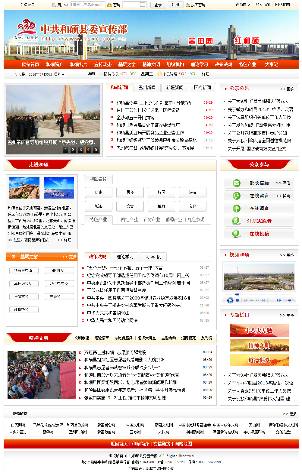 和碩縣宣傳部網(wǎng)站。和碩縣位于新疆中部天山南麓,北倚天山,南瀕博斯騰湖,是進入巴州和南疆的門戶,素有“龍駒之鄉(xiāng)”的美稱。全縣行政區(qū)劃面積1.28萬平方公里,轄6鄉(xiāng)1鎮(zhèn)、29個行政村、5個社區(qū),總?cè)丝?.55萬人,主要以漢、蒙、維、回等民族為主,其中少數(shù)民族27065人,占總?cè)丝诘?5.8%(維吾爾族12167人,占16.11 %;蒙古族6954人,占9.21%;回族7179人,占9.51%;其他民族765人,占1%)。境內(nèi)駐有63650部隊、94095部隊、農(nóng)二師24團、巴州清水河農(nóng)場等單位。全縣有山地面積6500平方公里,宜耕荒地125.1萬畝,耕地面積45萬畝。