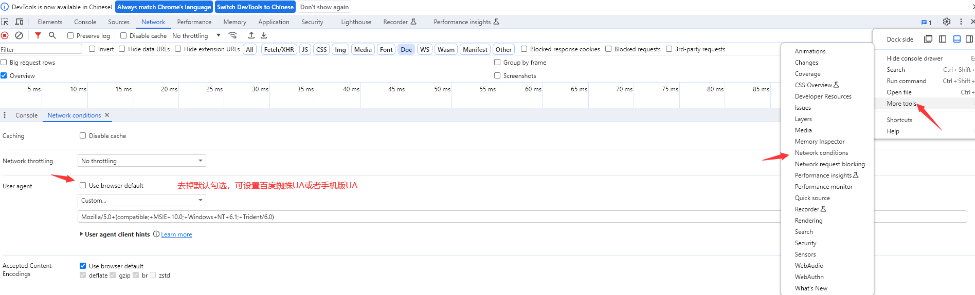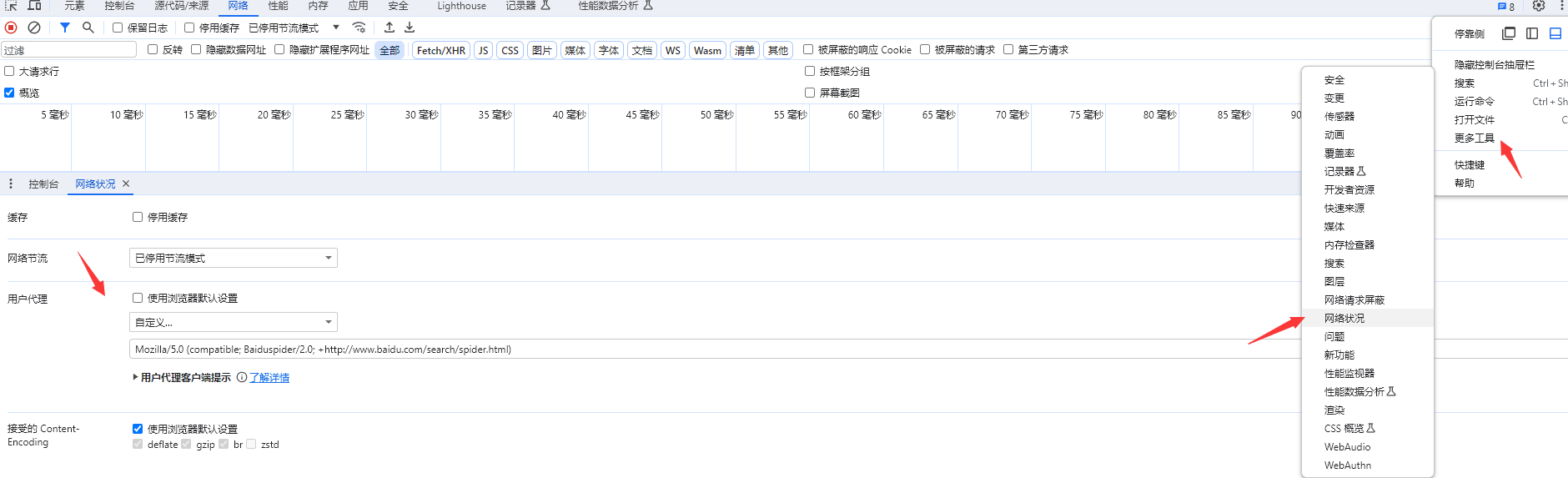 具體操作步驟為:按F12打開開發(fā)者工具--更多工具--網(wǎng)絡(luò)狀況,修改UserAgent為百度爬蟲: