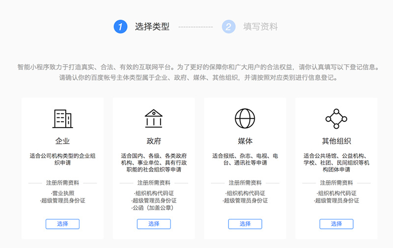 百度智能小程序目前僅面向 企業、 政府、 媒體及 其它組織等非個人主體開放申請,個人暫時無法申請。所以在申請注冊的時候,需要提供 企業或是 政府、 媒體及 其他組織的一些信息。申請入駐之前需要注冊、登錄百度賬號。